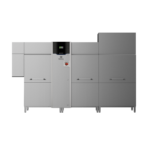 Elektrische pannen- en pottenwasmachine met elektronische bediening, afvoerpomp, doseerpompen voor reinigingsmiddel en glansspoelmiddel en hoge doorvoeropening.