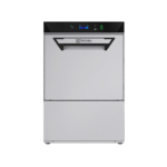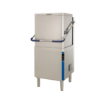 Doorschuifvaatwasmachine met enkelwandige handmatige kap, atmosferische boiler, geïntegreerde wasmiddeldoseerder, naspoelmiddeldoseerder en afvoerpomp, capaciteit tot 80 rekken per uur.
