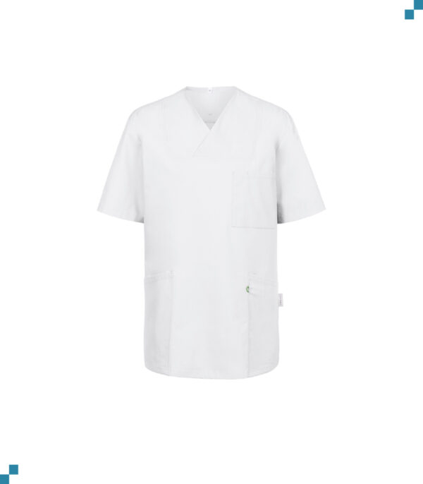 Enveloppe kraag, korte mouw, 2 opgezette zakken, borstzak met pennenvakje, zijsplit, sleutelhanger geïntegreerd in linker zak, ruglengte 75 cm/maat M.