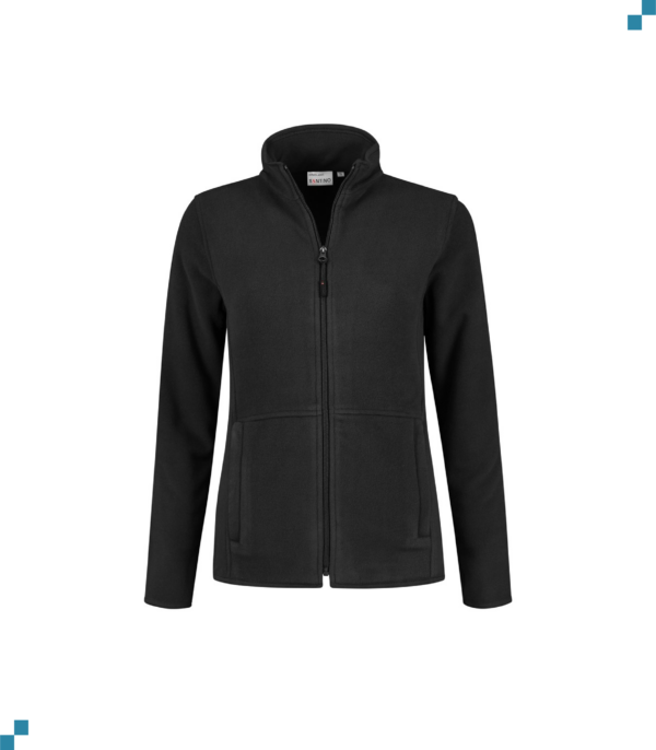 Fleecejack, 100% polyester, 280 gr/m², polar fleece, tweezijdig geruwd, buitenzijde anti-pilling behandeling, ladies fit, opstaande kraag, mouw met elastische binding, 2 steekzakken met YKK rits en onderzijde verstelbaar middels koord en stopper.