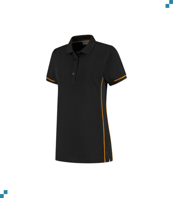 Poloshirt, 50% gerecycled polyester / 48% organisch katoen / 2% elastaan, GRS en OCS gecertificeerd, 210 gr/m2, piqué, ladies fit, contrast piping, plat gebreide polo- ribkraag, 4- knoopsluiting, korte mouw met 1×1 ribboord en 3D Santino logo transfer op onderzijde.