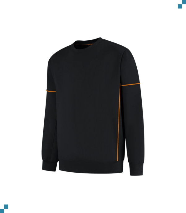 Sweater, 50% gerecycled polyester / 48% organisch katoen / 2% elastaan, GRS en OCS gecertificeerd, 320 gr/m², French terry met geruwde binnenzijde, unisex, regular fit, contrast piping, ronde hals, mouw en tailleband met 1×1 ribboord. 3D Santino logo transfer op onderzijde.