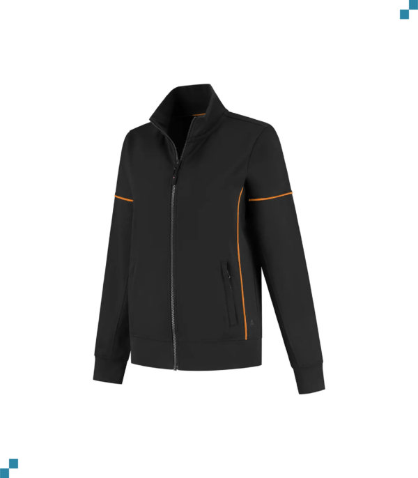 Sweatvest, 50% gerecycled polyester / 48% organisch katoen / 2% elastaan, GRS en OCS gecertificeerd, 320 gr/m², French terry met geruwde binnenzijde, ladies fit, contrast piping, opstaande kraag, voorsluiting YKK rits, 2 steekzakken met YKK rits, mouw en tailleband met 1×1 ribboord. 3D Santino logo transfer op onderzijde.