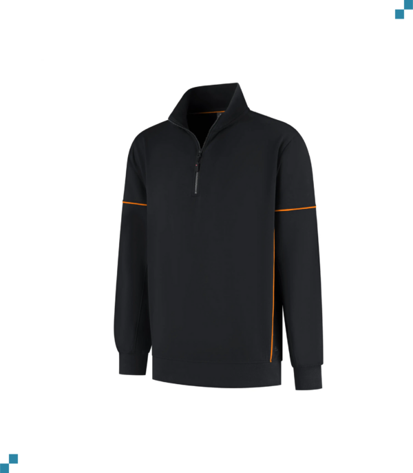 Zipsweater, 50% gerecycled polyester / 48% organisch katoen / 2% elastaan, GRS en OCS gecertificeerd, 320 gr/m², French terry met geruwde binnenzijde, unisex, regular fit, contrast piping, opstaande kraag met korte YKK rits, mouw en tailleband met 1×1 ribboord. 3D Santino logo transfer op onderzijde.